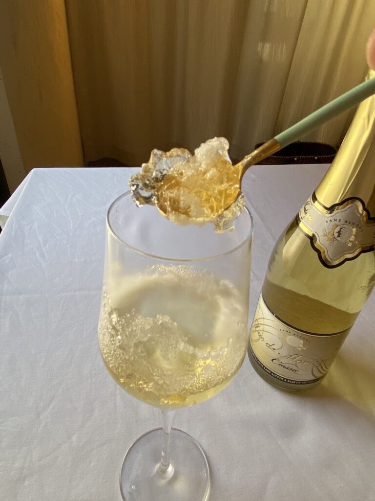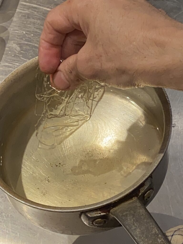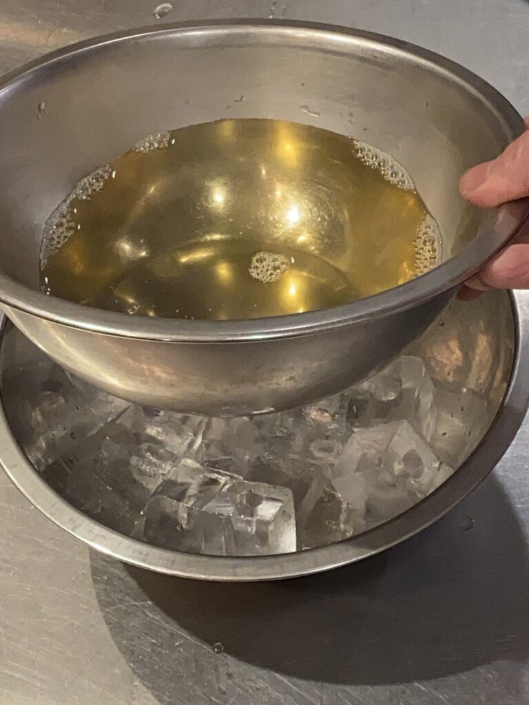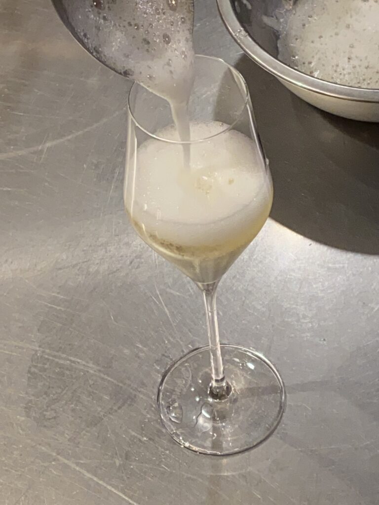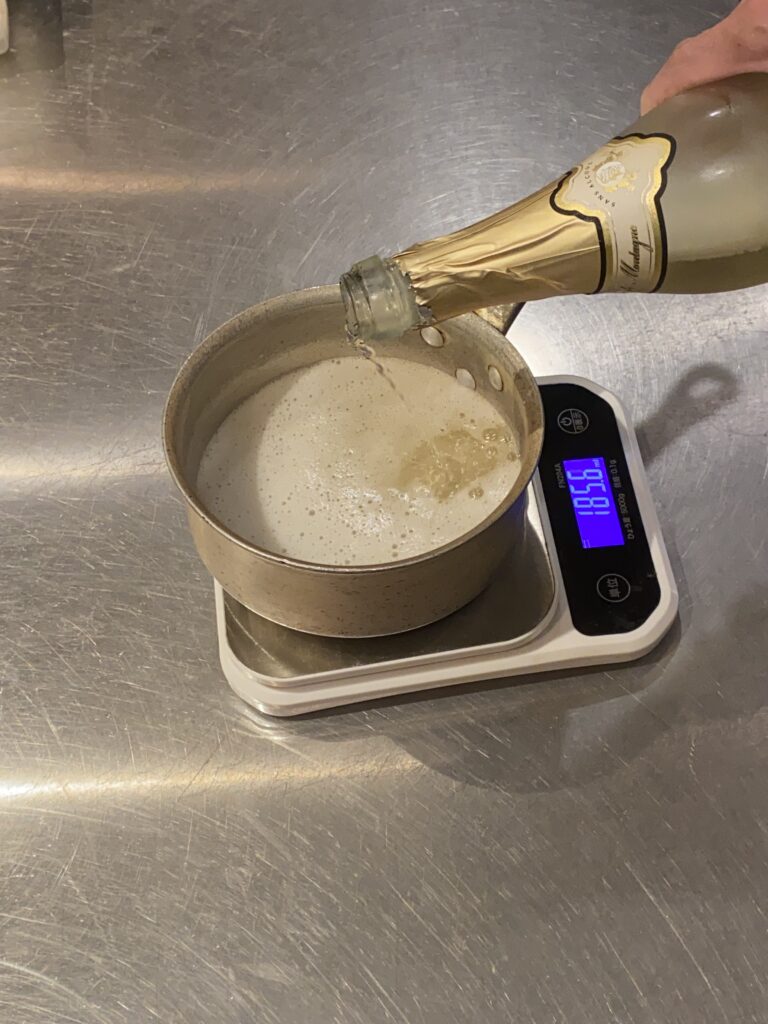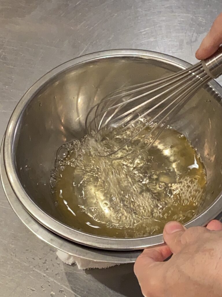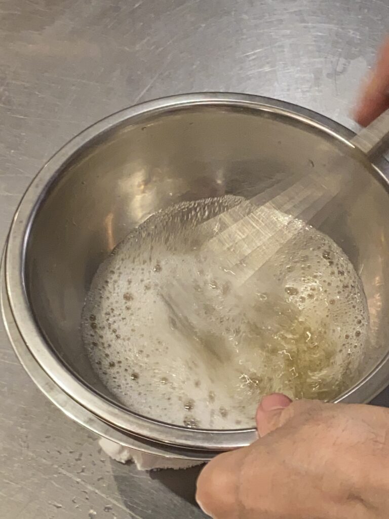 このまま器に注いでゼリーにしてもいいですが、今回はスパークリングワインっぽく泡を作っていきます。