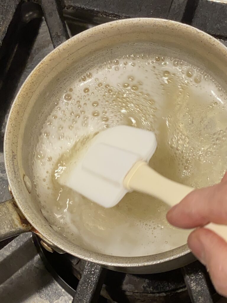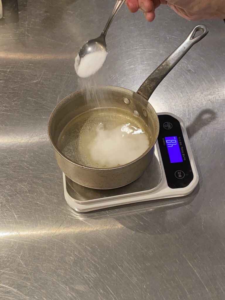 火にかけ、軽く沸かし、砂糖を溶かします。